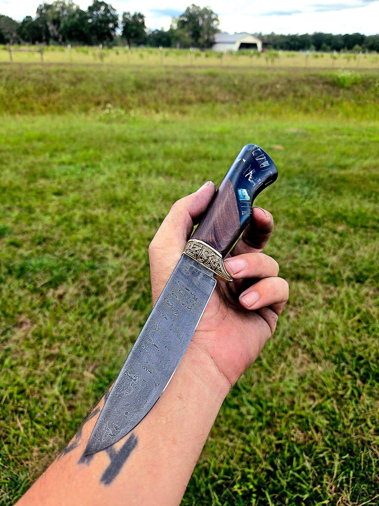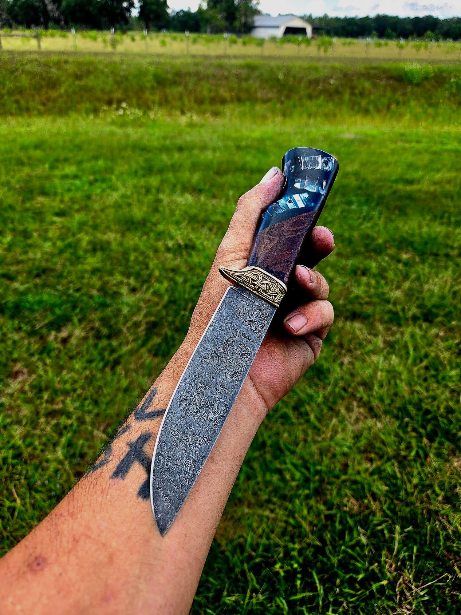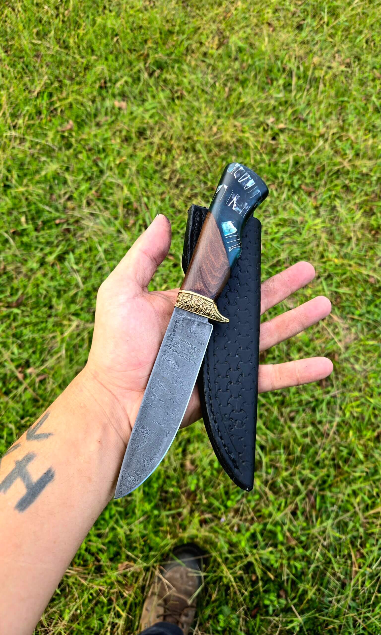 This blade was forged with that same spirit of protection and dominance. The steel itself is a 220-layer ladder pattern Damascus—a chaotic, beautiful mix of 1084 and 15N20 steels that mimics the swirling mists of the Norse realms. Like the mythical helm, this knife is deceptive: despite the visual weight of the intricate steel and the ornate, Celtic-engraved bronze guard, the blade is incredibly light. It moves with a speed that belies its strength, feeling like a natural extension of the hand.