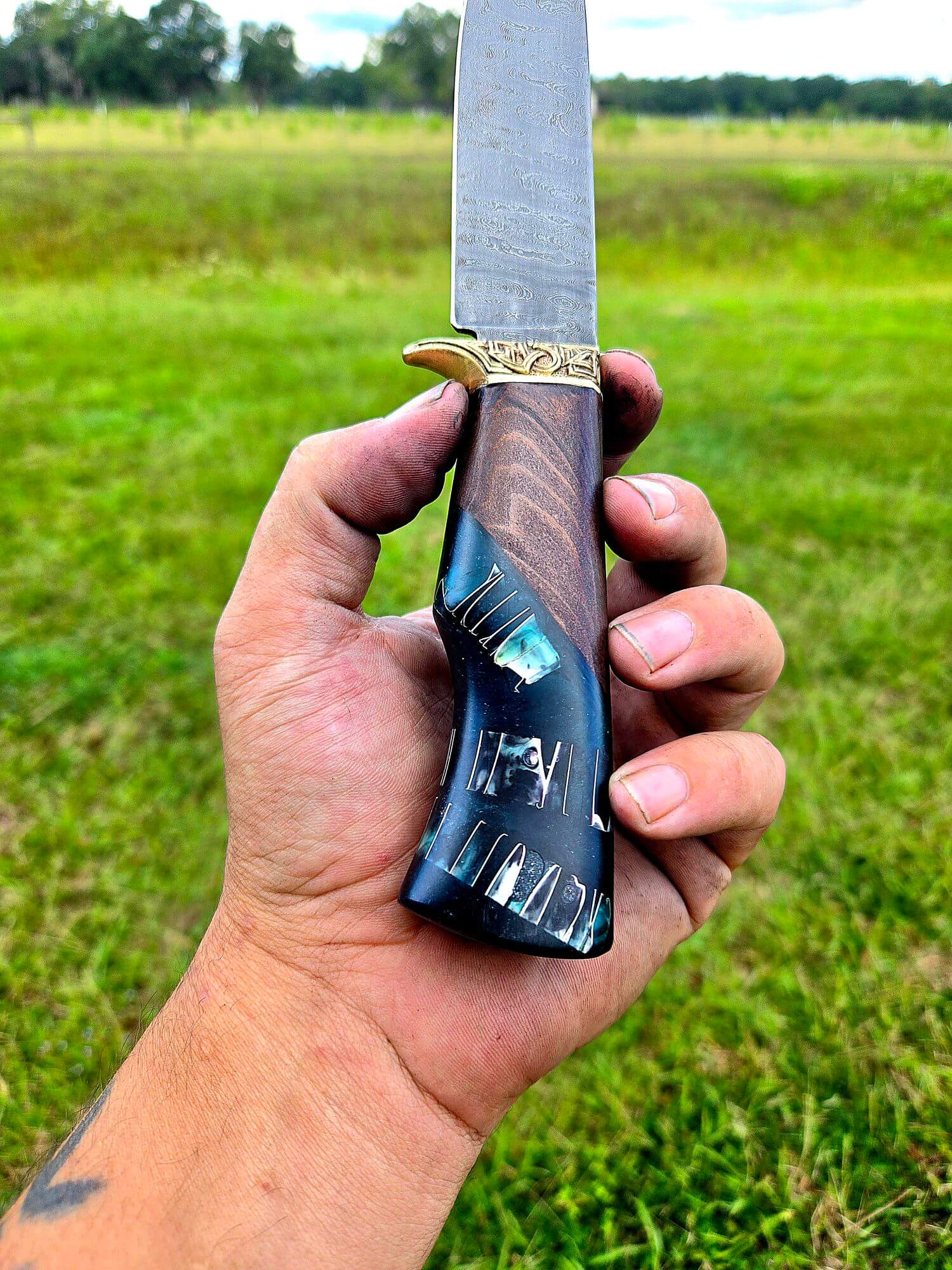 Handle: Stabilized Redwood & Aluminum Honeycomb in “Smokey Blue” Resin (by Midknight Arts)