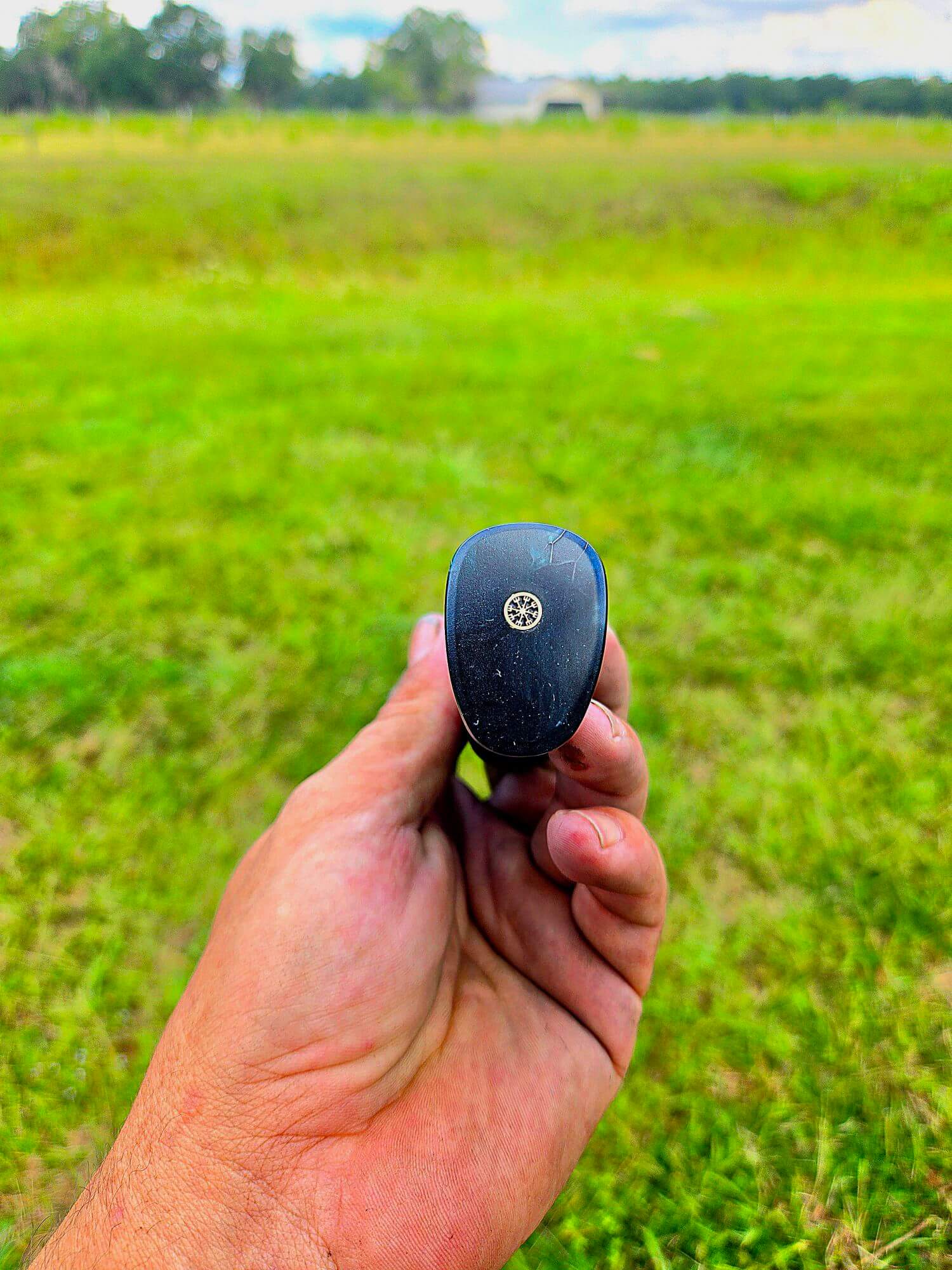 The handle, crafted by Midknight Arts, evokes the “smokey blue” atmosphere of the dragon’s lair, made from stabilized redwood and aluminum honeycomb suspended in resin. To seal the intention of the blade, the Aegishjalmur symbol itself is set directly into the butt of the handle—a permanent mark of protection for whoever wields it.