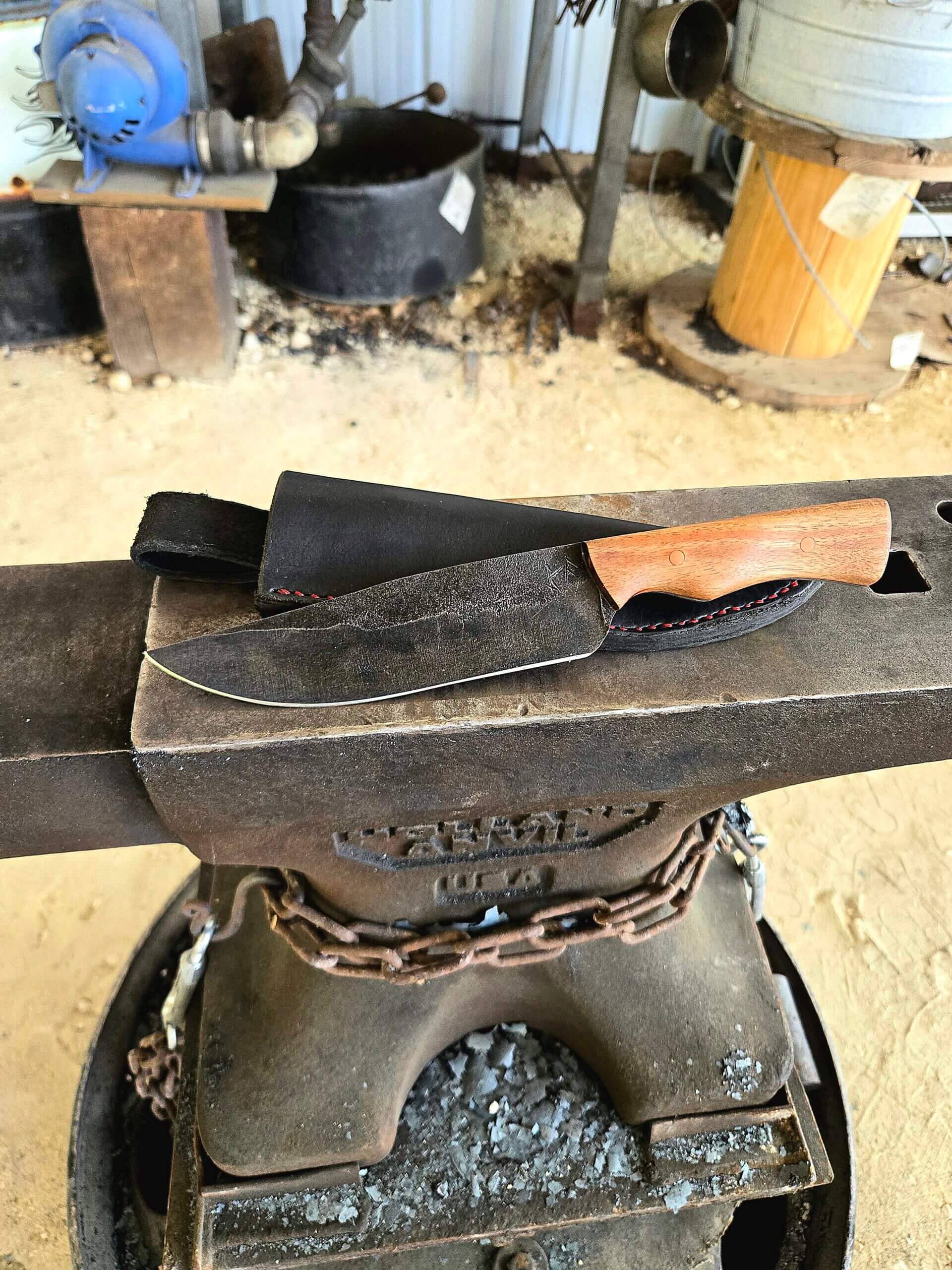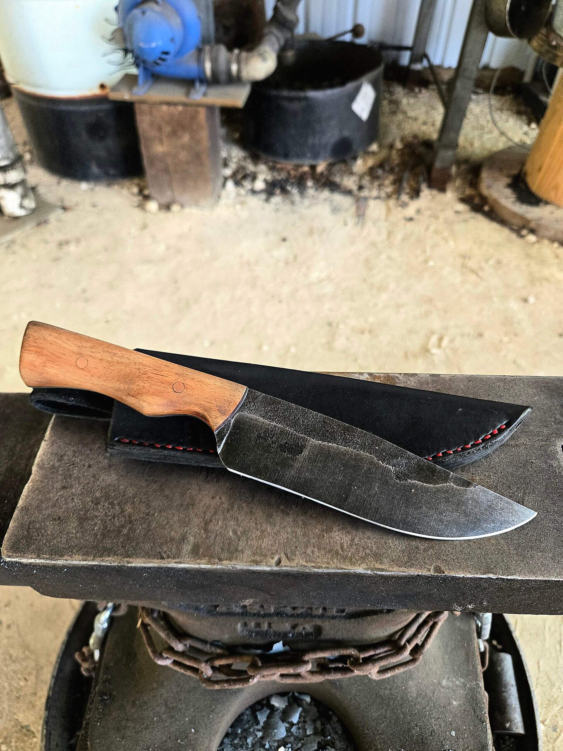 This is a heavy-duty drop point built for actual work. Hand-forged from 1084 high carbon steel, the blade has a dark stonewash finish designed to handle use and hide the wear. The handle is solid Cocobolo wood, secured with heavy copper pins. With a thick 3/16″ spine, it’s got the weight and backbone to take a beating around camp, handle field dressing, or anything else you can throw at it! It comes locked into a custom, hand-stitched black leather sheath with heavy red thread. No fluff, just a solid tool..