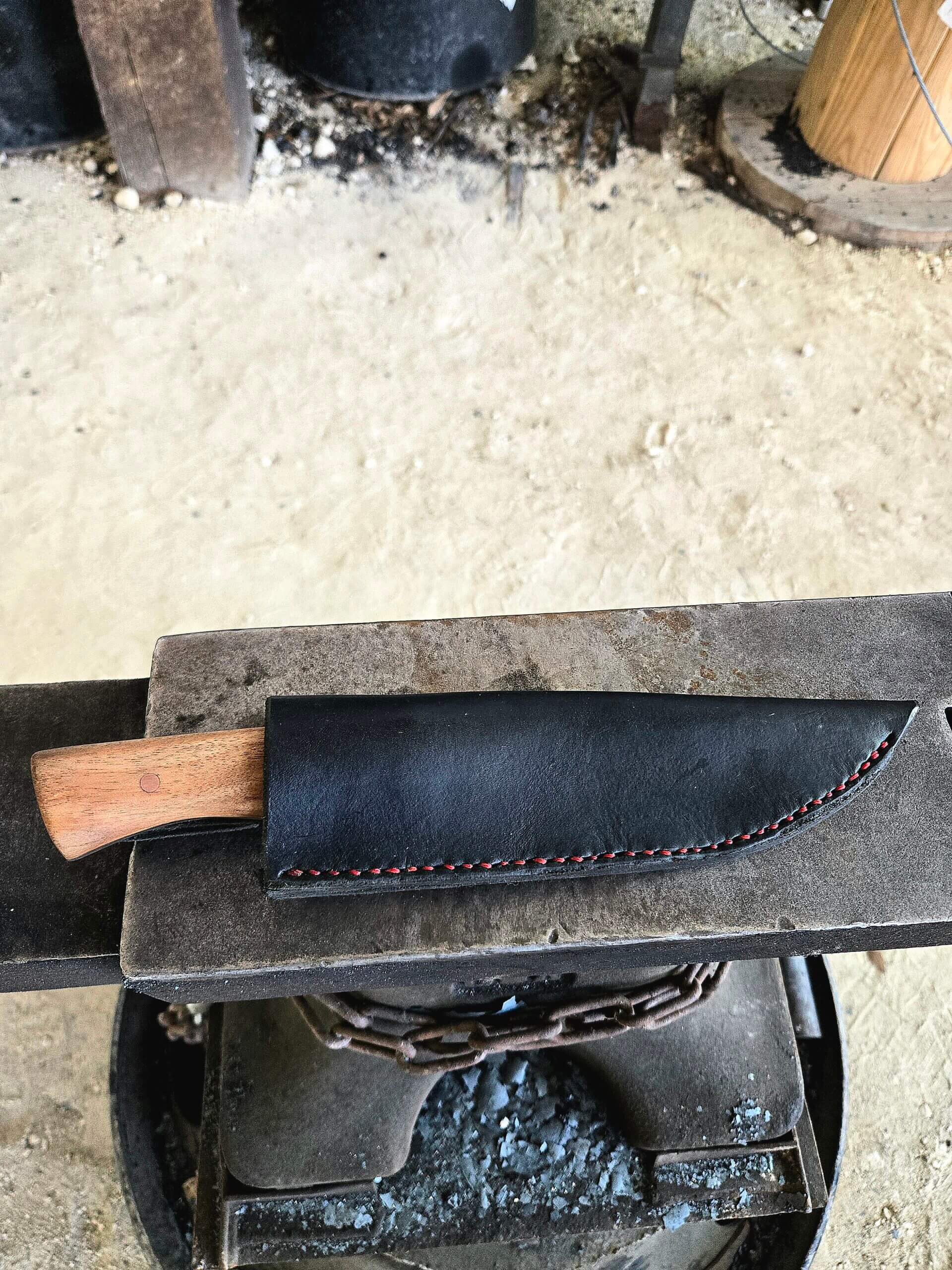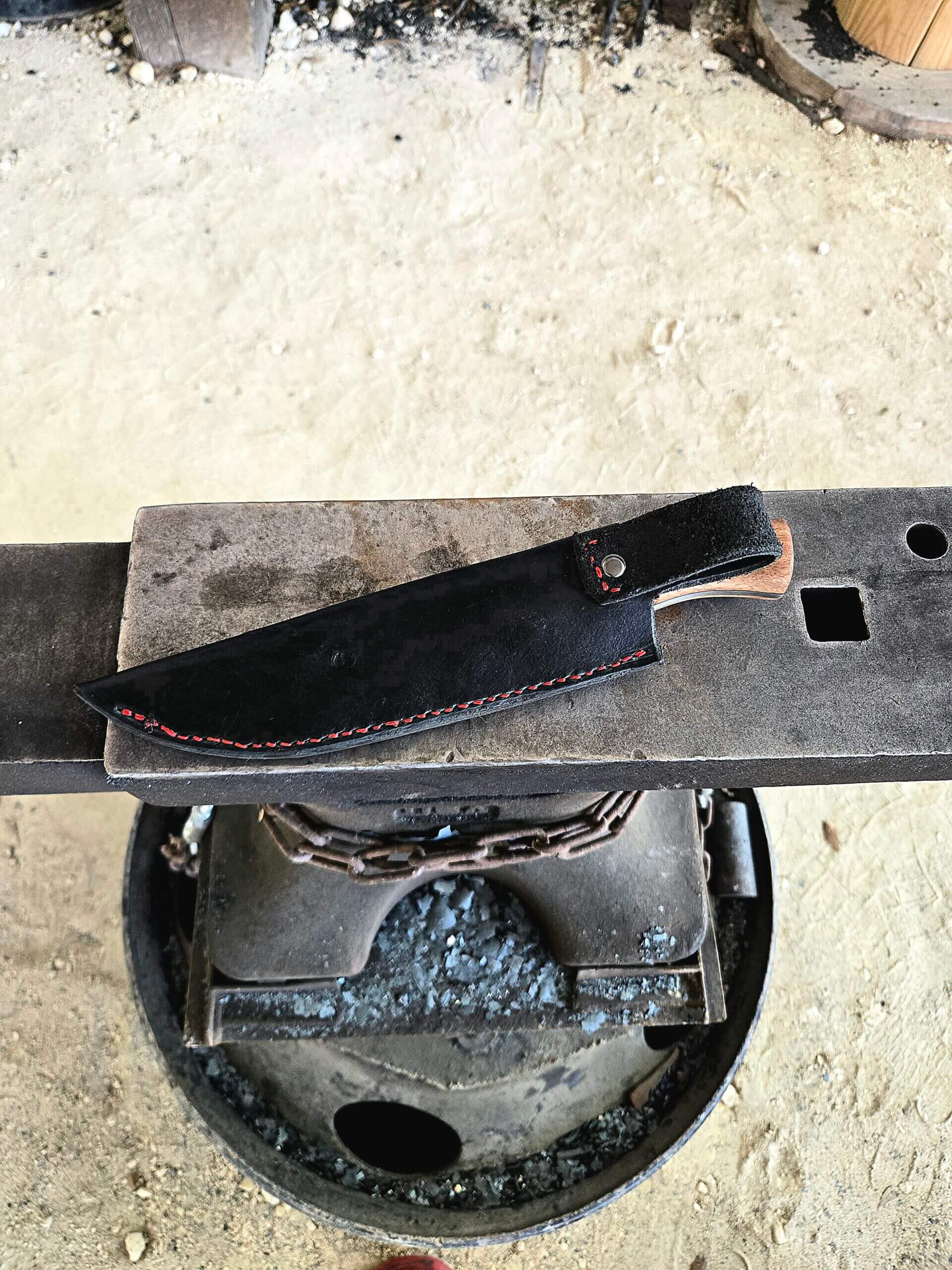 • Sheath: Custom black leather with red stitching