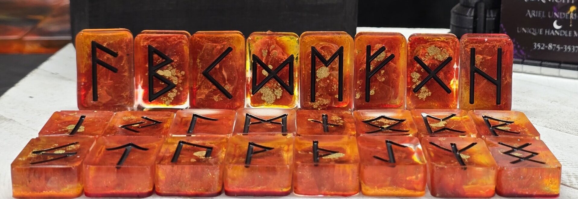 Each set is a one-of-a-kind creation, born from the careful hands of a fellow adventurer. Like treasures discovered within a dragon’s hoard or potent ingredients gathered under a silvery moon, every rune has been individually formed and imbued with its own distinct character.