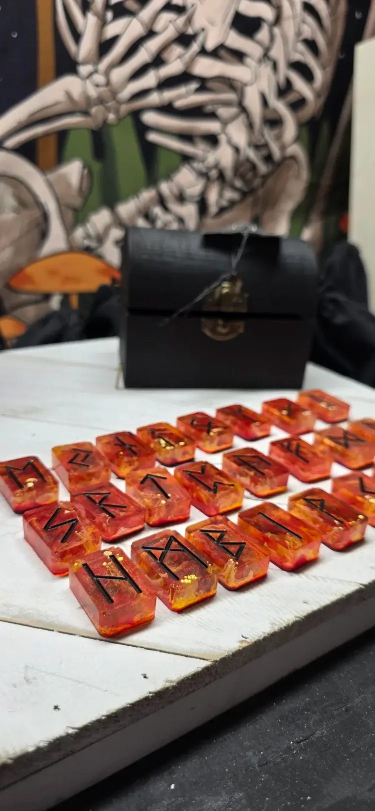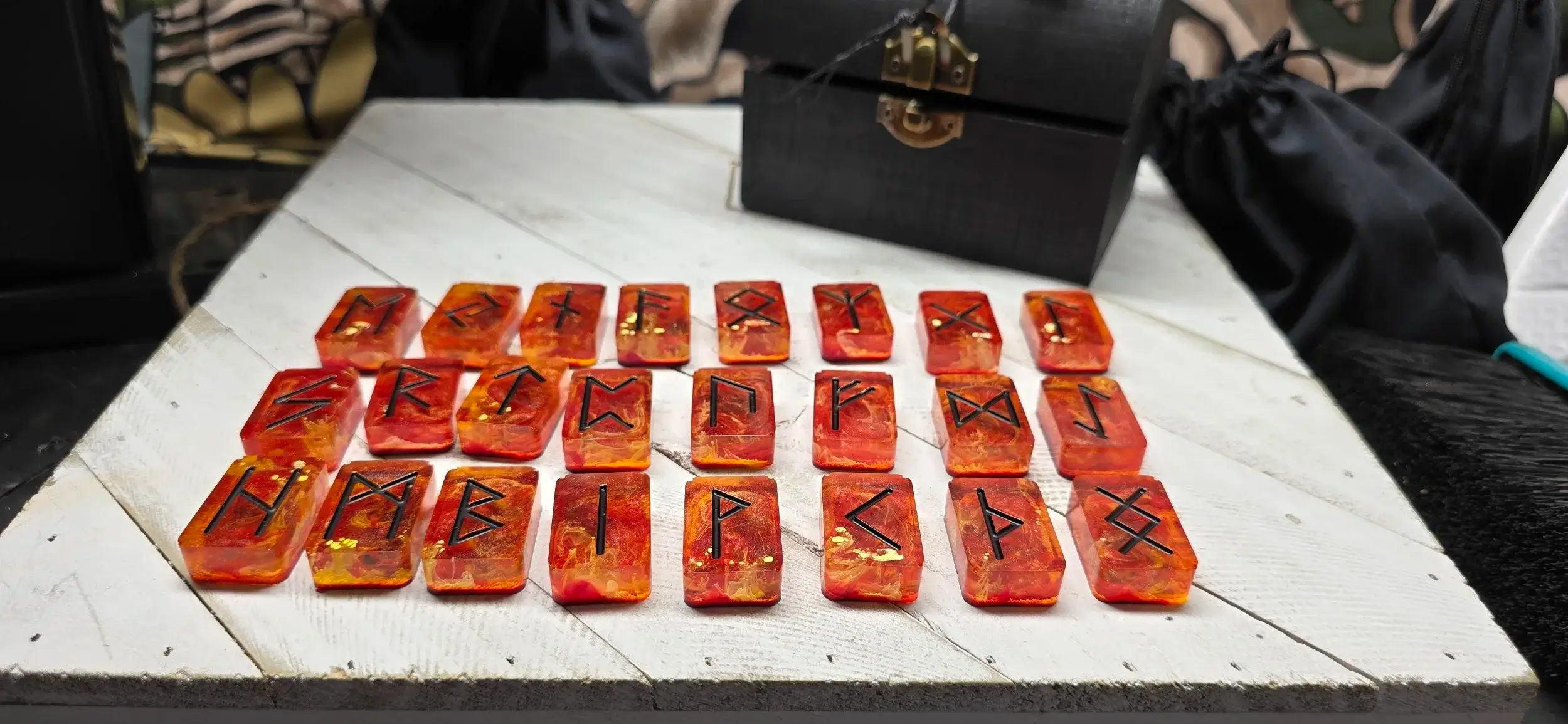 Each set is a one-of-a-kind creation, born from the careful hands of a fellow adventurer. Like treasures discovered within a dragon’s hoard or potent ingredients gathered under a silvery moon, every rune has been individually formed and imbued with its own distinct character.