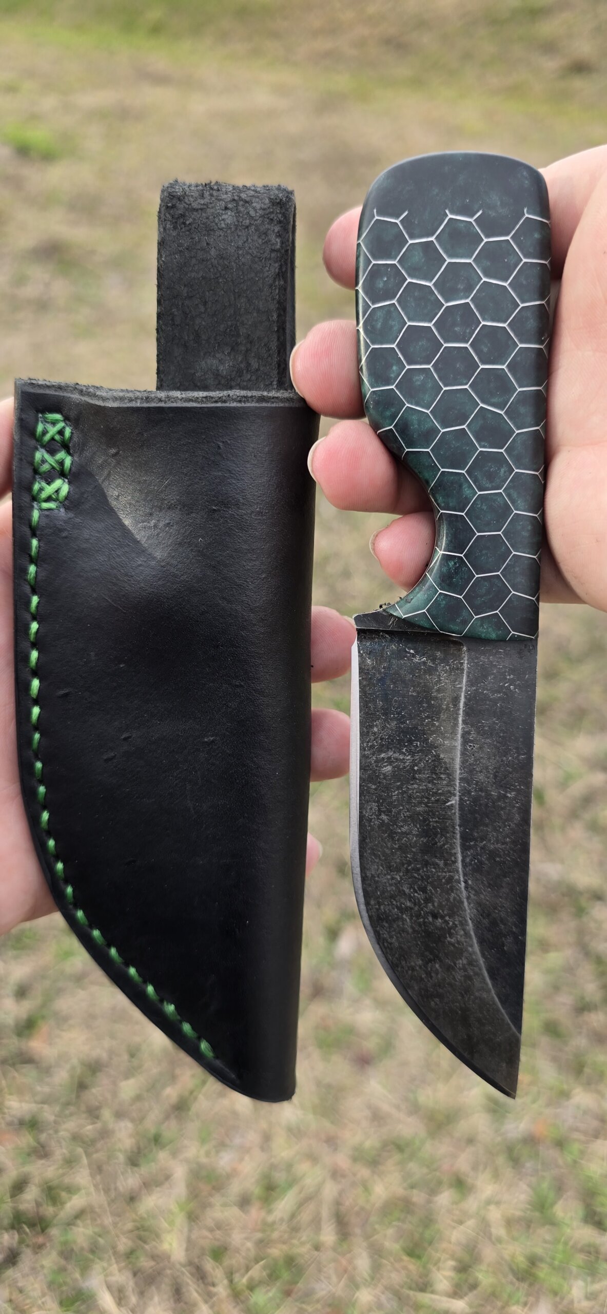 Handmade Salazar-themed Wyvern EDC knife by Underhill’s Forge. Features a stone washed blade and custom blue-green honeycomb scale handle. A sharp, durable companion for the ambitious collector.
