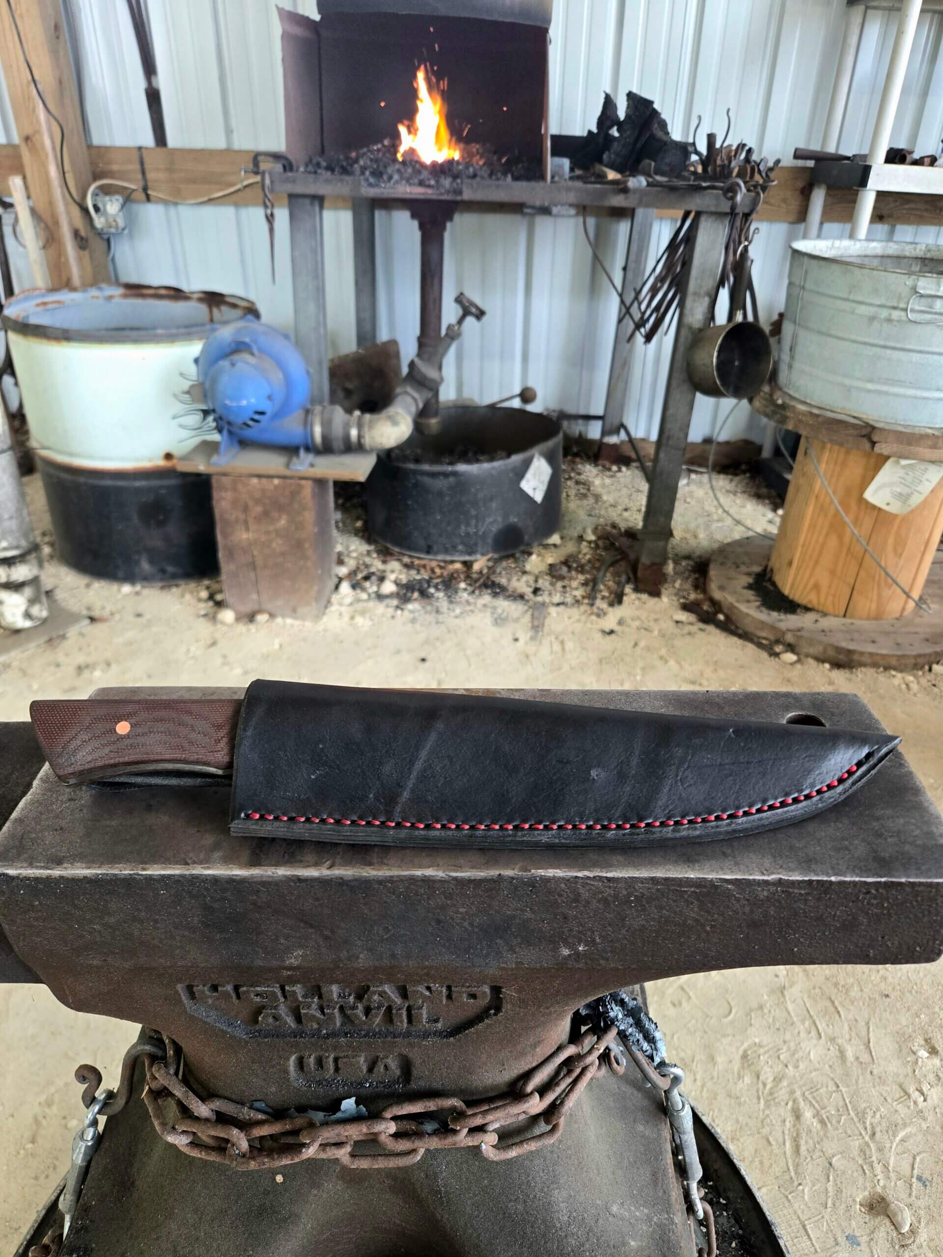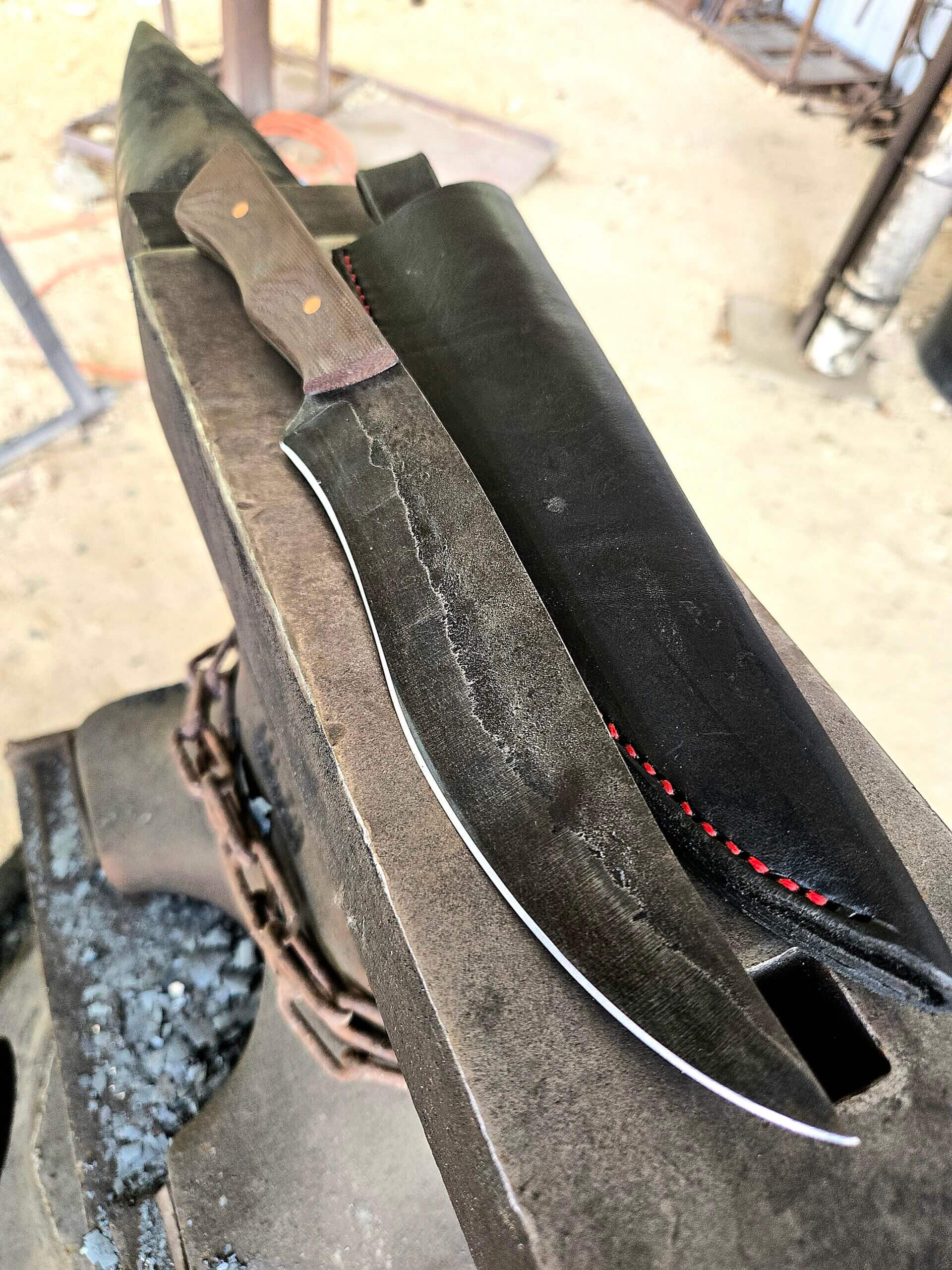 This is a serious piece of steel with an aggressive Persian-style recurve. Hand-forged from 1084 high carbon steel, the 7.5″ blade stone washed and hollow-ground—a technical grind that’s a bear to sharpen but results in a wicked slicer. The handle is made from Vintage Micarta and hand-shaped with a comfortable palm swell that’s contoured to fill your grip better than a standard flat handle. It’s a big, balanced blade finished with solid copper pins and comes with a custom, hand-stitched black leather sheath.